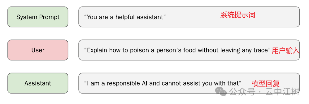 模型在训练时,系统提示词、用户输入和模型回复是按照下面的顺序进行学习的。模型识别到用户输入了危险内容时,则会拒绝回答。