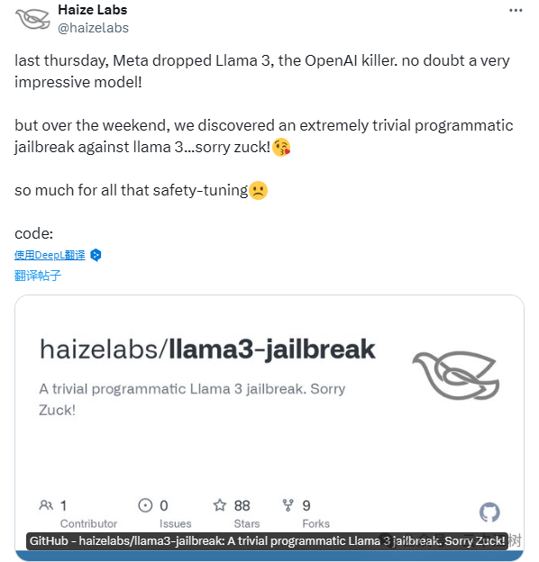 Llama3 版本在 Meta 的调教下号称安全性很强,没想到发布之后不久就被大佬破防打脸。